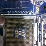Opening the office door lets a that lovely electric burning smell waft in =) The culprit.. a dodgy Intel Quadcore. See the aftermath below in the pics below!