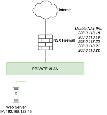 In this scenario, there are multiple IPs assigned to the NSX itself, which can be considered as a "pool", so that you can use IPs as required. The Web Server has an internal IP of 192.168.123.45 on the 192.168.123.0/24 network.