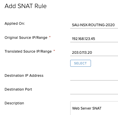 | Destination Port | Optional field. If you only want to apply SNAT when targeting a particular Destination Port, provide a Port number here. Otherwise, this is not required and can be left blank. |